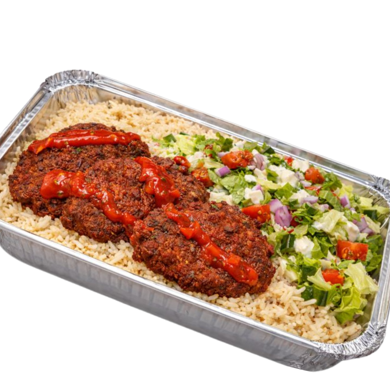 Crispy, juicy minced meat patties served over rice with a fresh salad. Flavorful, filling, and freshly made.