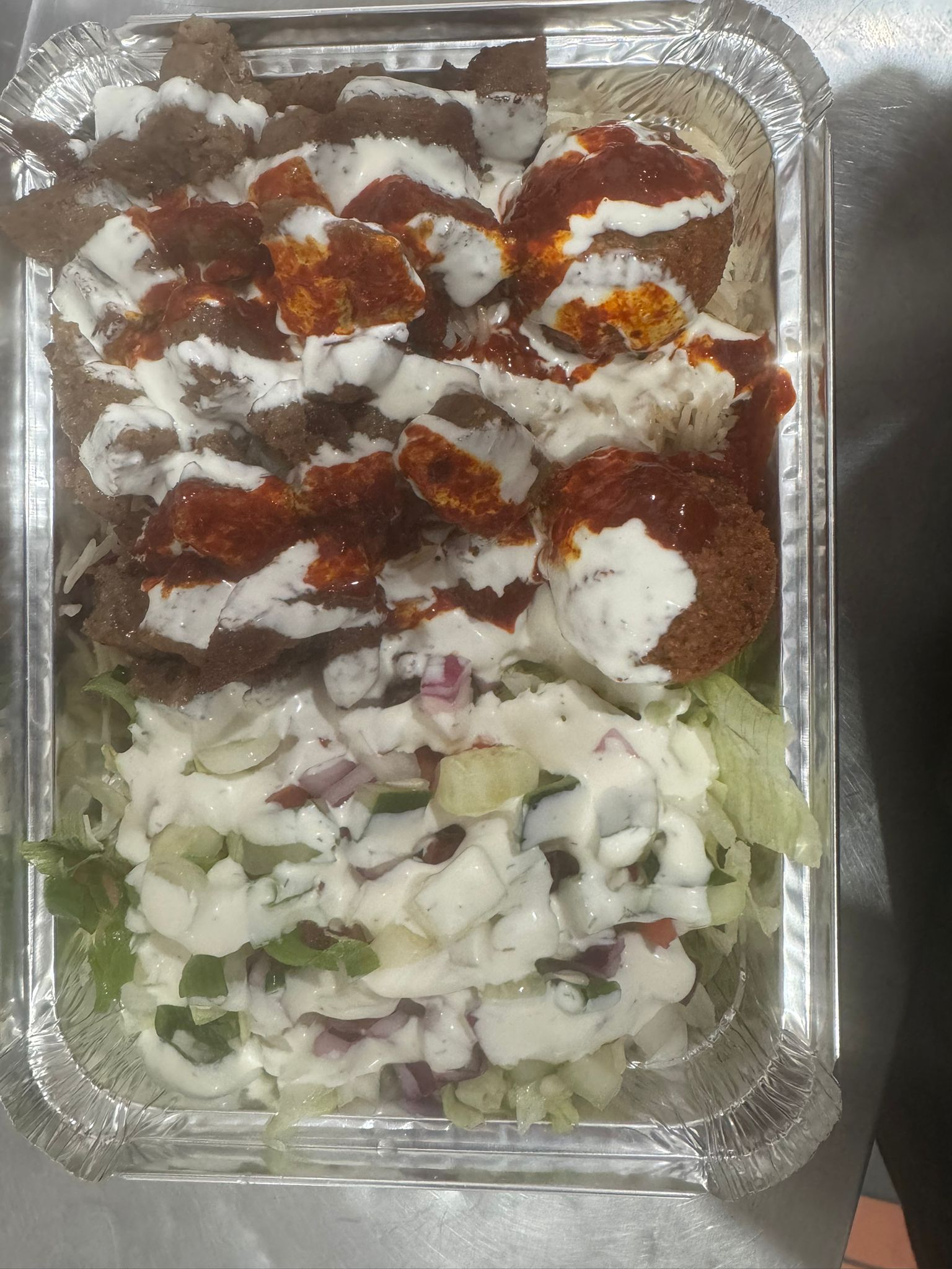 A hearty bowl of chicken/lamb/falafel over fragrant basmati rice, paired with lettuce, tomatoes, white onions, purple onions, green onions, and finished with our smooth white sauce.
